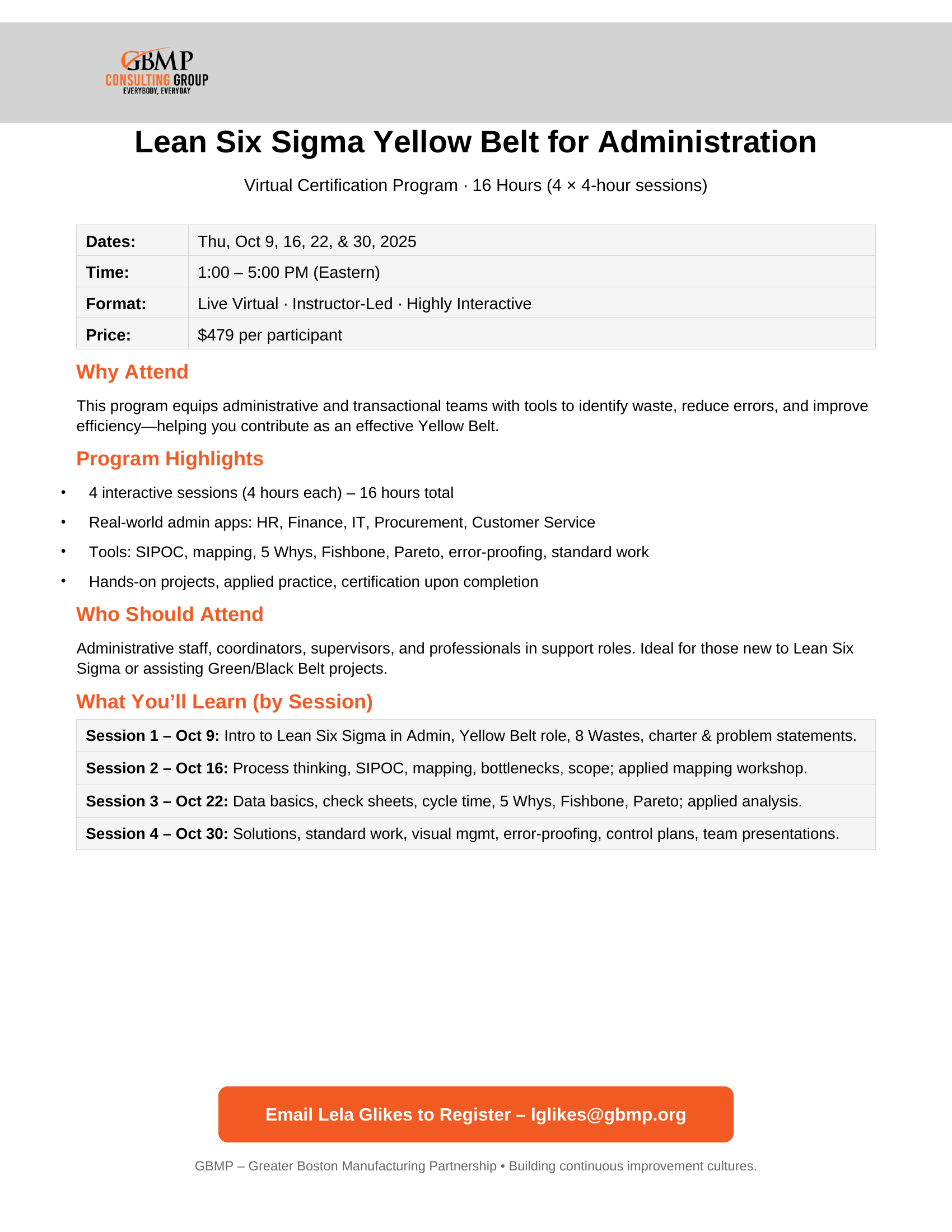 Don't forget to use your GBMP Member benefits when you make purchases on ShopGBMP. Members save 20% off all of our Lean training products, and get free seats in our virtual workshops, discounted tuition in Certificate programs, savings on GBMP's annual Northeast Lean Conference and much much more! For on-demand streaming of any of GBMP's Lean training videos, visit www.Leanflix.org.